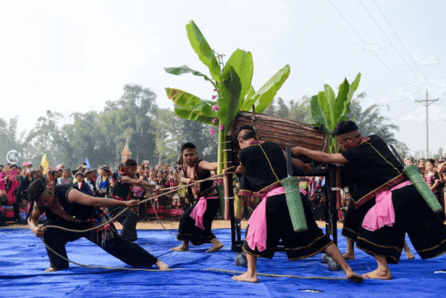 节日期间,男女老少身着盛装,男性手持长刀,女性挥舞彩扇,在瑙双(领舞者)的带领下,沿着世代相传的舞蹈路线,环绕目瑙示栋纵情歌舞。上万人步调一致,队形变幻有序,场面无比壮观,被誉为“万人狂欢舞”。