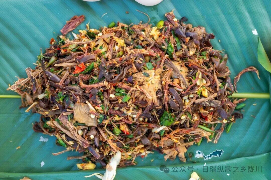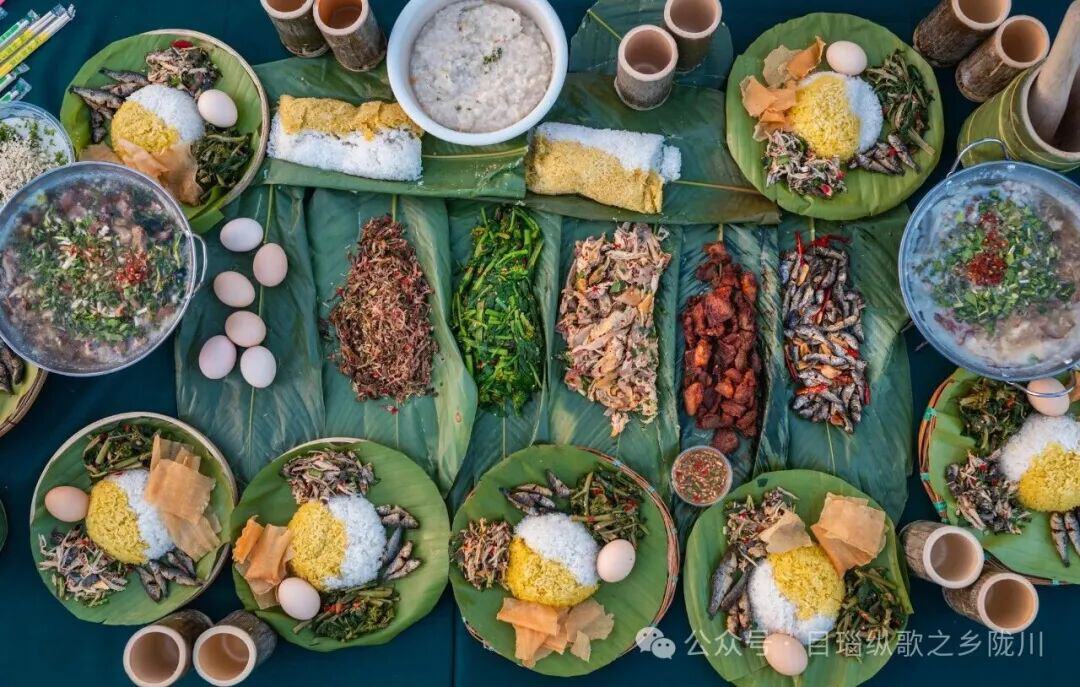 绿叶宴是景颇族待客的最高礼节,所有菜肴用新鲜的芭蕉叶或树叶包裹盛装,鬼鸡、舂干巴、竹筒肉、凉拌野菜……每一道都是天然原生态,用手抓着吃,把山林滋味吃进嘴里。