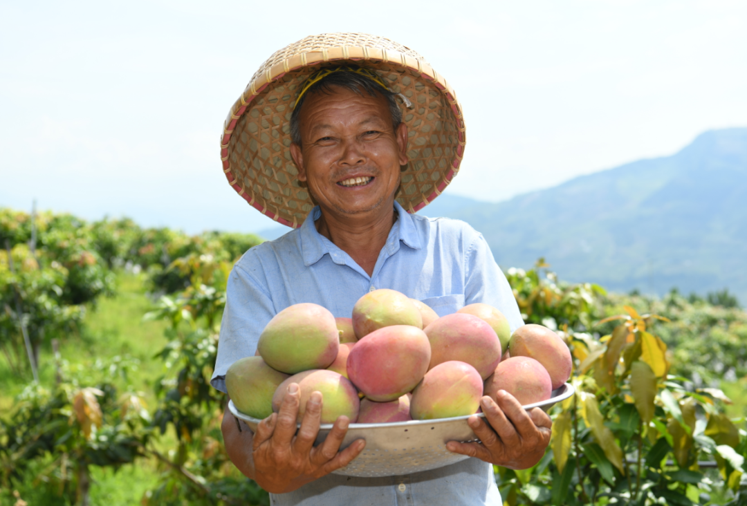 在华坪县荣将镇龙头村果子山,果农展示采摘的芒果。( 丽江融媒记者 赵庆祖 摄)