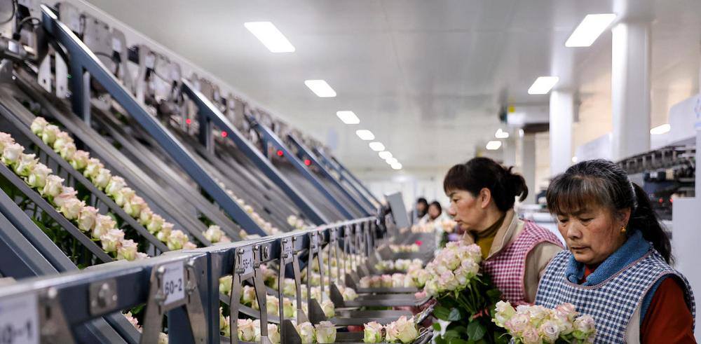 在晋宁区云天化花匠铺花卉产业现代化示范园,工作人员整理分好级的玫瑰鲜切花。 记者 胡妤雅 摄