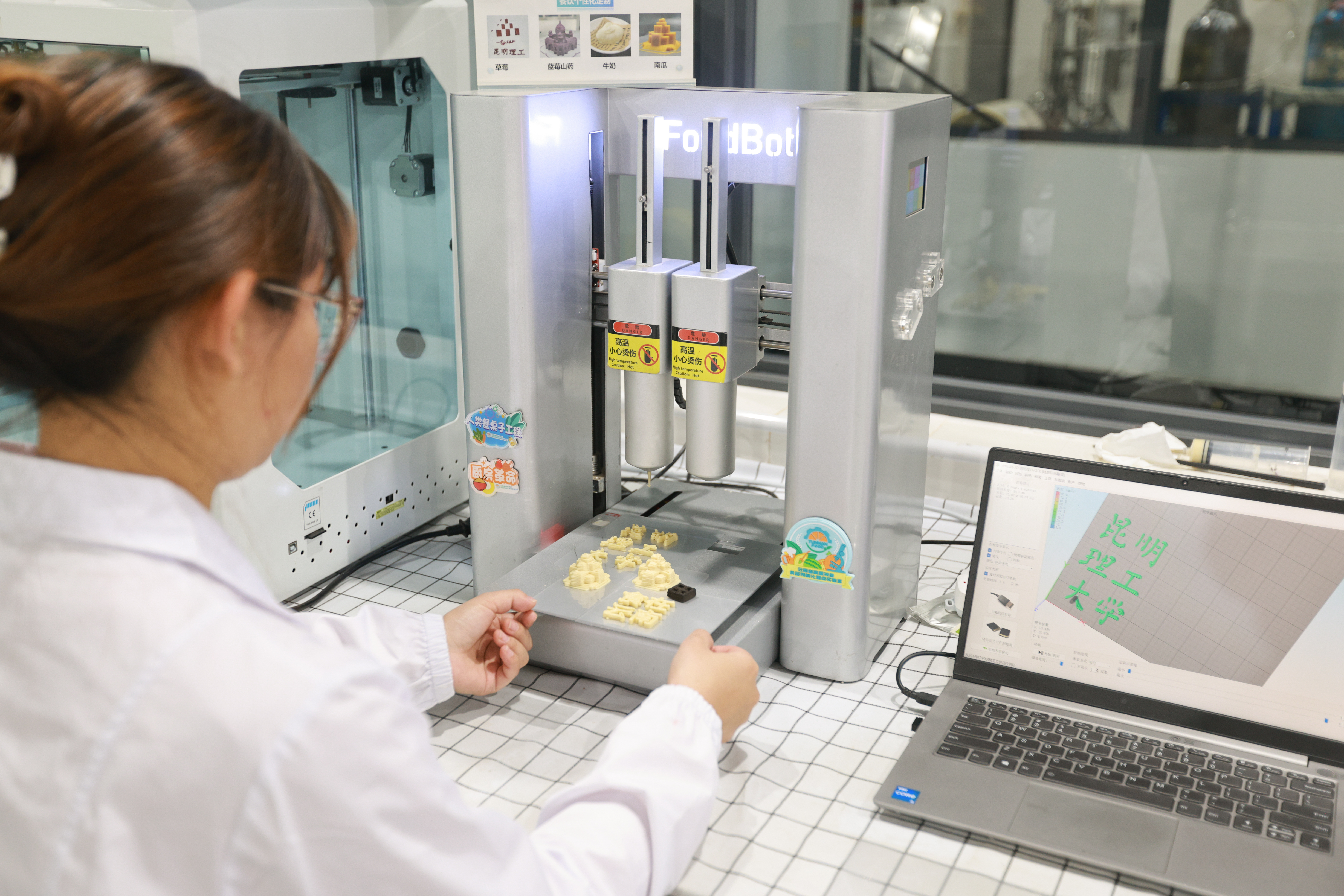 一旁的挤压型食品3D打印机,将南瓜、牛奶、蓝莓山药等天然原料层层堆叠,按需打印出老人适配的软糯餐食、孩子喜爱的趣味造型。“我们更攻克了4D变形食品技术,微波加热后食品自动‘变身’,完美解决传统3D打印无支撑悬空结构的行业难题。”食品3D打印与AI糖画机研发者、昆明理工大学食品科技与工程学院校聘教授郭超凡,边操作边分享技术突破,敢闯敢试的探索精神,让实验室的创新边界不断延伸。