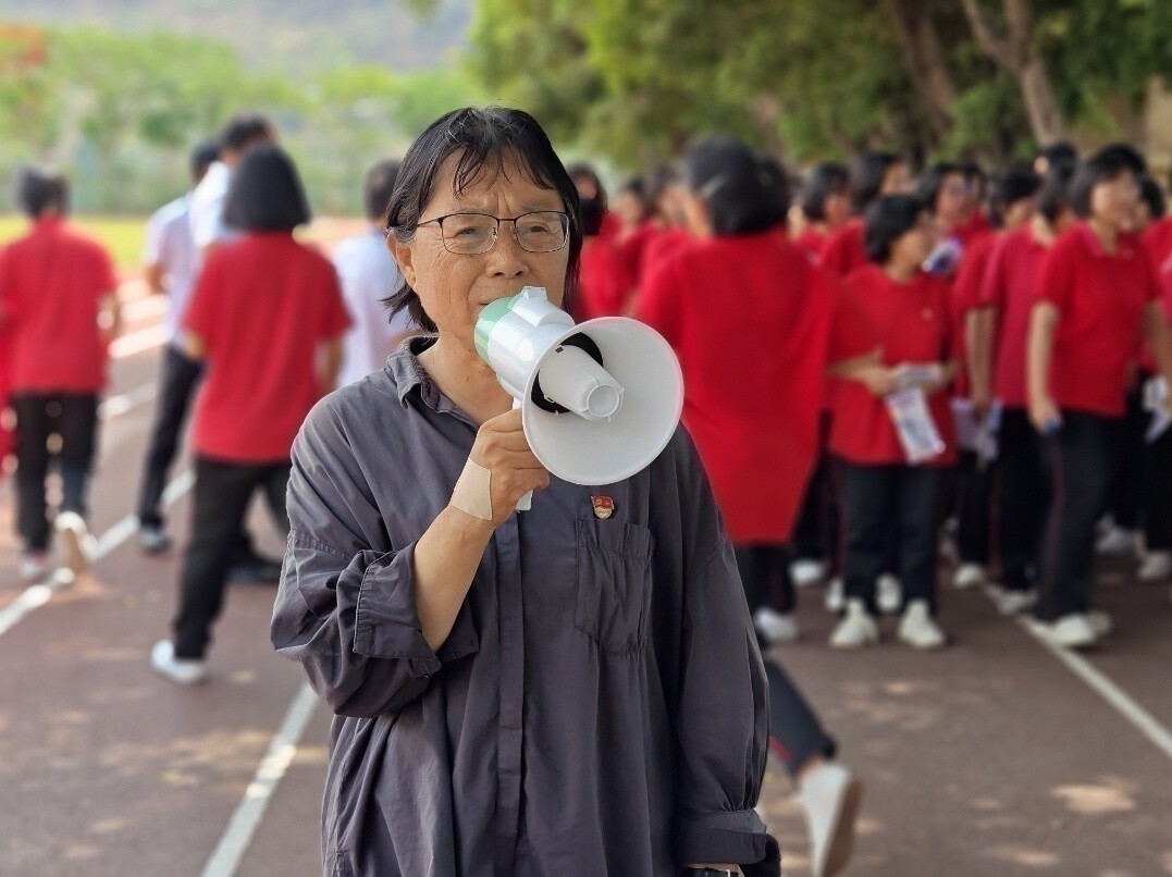 张桂梅拿着小喇叭为高三女孩们送考。苗少坡摄