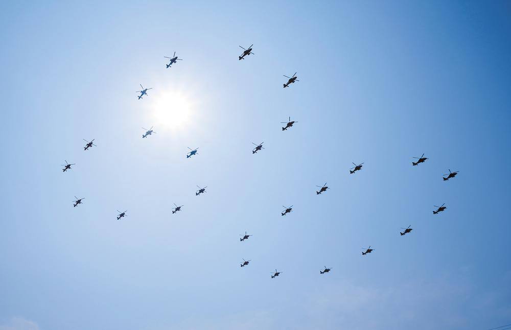由26架直-19武装直升机组成的“80”字样。 新华社记者 杜宇 摄