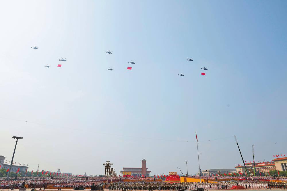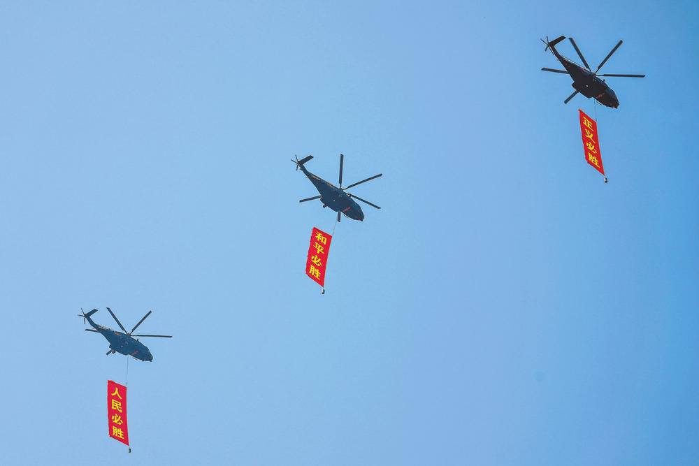 3架直-8L运输直升机悬挂“正义必胜”“和平必胜”“人民必胜”条幅。 新华社记者 郑焕松 摄