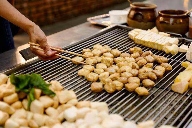 铁网上,乳白的豆腐块在炭火中“滋滋”作响,鼓起金黄的泡,香气随夜风飘散。食客围坐小凳,手持竹签,蘸上腐乳、辣椒、香菜调制的秘制蘸水,一口咬下,外焦里嫩,豆香满口。这不仅是小吃,更是一种仪式——慢火、慢烤、慢吃,建水人把时间熬进了豆腐里。