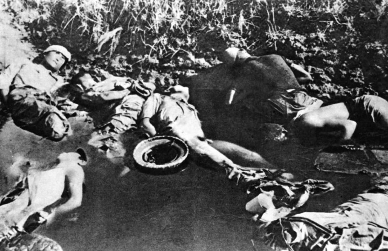 图为在南京大屠杀中,日军把无辜的中国人反绑双臂枪杀后,掷入城郊池塘。新华社