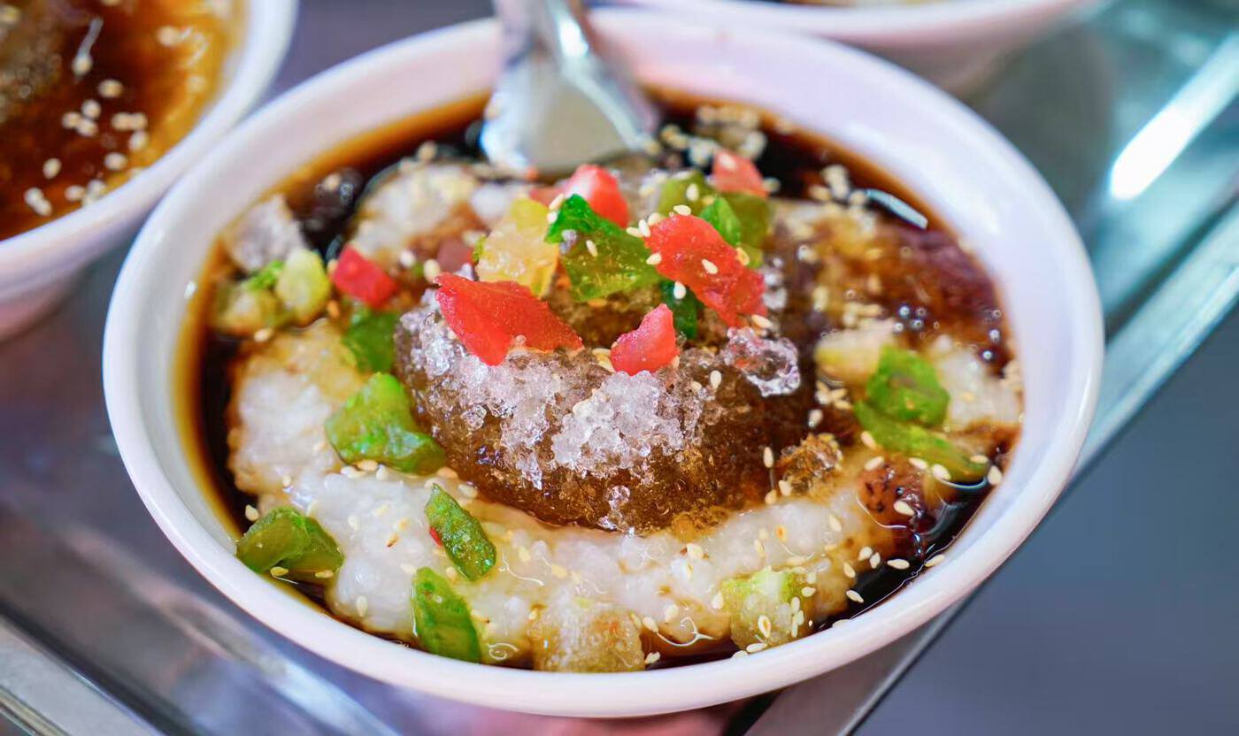 玉溪有名的冰稀饭是选用本地糯米煮成的稀饭,加入冰块、红糖稀、芝麻、红枣、红绿丝,还有玉溪本地特产蜜饯,有的店里还会加上水果,搅拌后食用。糯米的柔软加上配料的香甜,冰凉的感觉十分适合夏天吃,清凉解暑,老少皆宜,是玉溪人必备的祛暑甜点。
