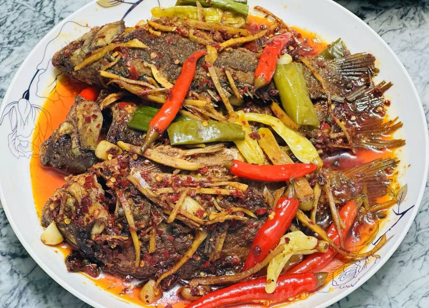“渎”是江川当地的土话,即红烧的意思。渎鱼做法看似简单,却很考验功夫。这道菜的精髓就在于鱼的选择,首选是星云湖中的鲫鱼。当地的老师傅突破传统,仅用酱油、糊辣椒、精盐、葱、姜、蒜等简单的调料,严格遵循用料比例,加上适宜的火候,将鱼烧至入味,汁少即成。