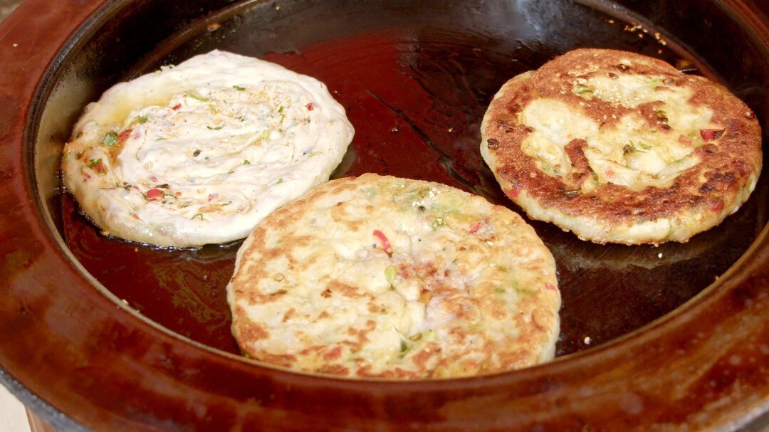 一种中国式的煎饼,也是通海特色小吃之一。提前用面粉、精盐、油、温水将面和好,需要发酵一下。馅料有猪肉碎、葱花、藠头,馅料可以自由选择,在平锅上煎至两面金黄即可。每天中午开始,南街上的葱花饼排了长长的队伍,很多人慕名前来品尝。
