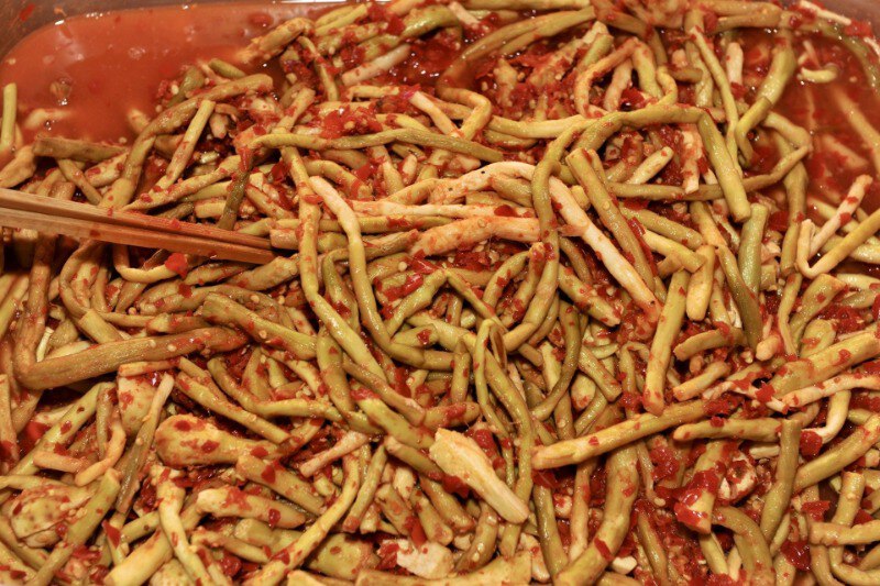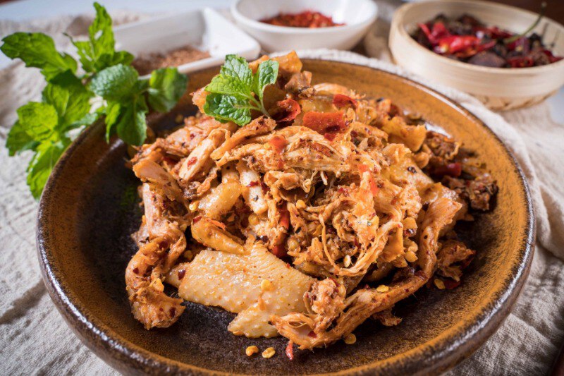 峨山舂菜的品类多样,舂肉、舂鱼、舂豆、舂菌子、舂蔬菜……“舂”无处不在,看似粗犷干脆的动作,却暗含着细腻柔韧的技巧。在峨山,无人不晓的舂菜莫过于舂鸡,而峨山舂鸡又以小街镇最为出名。舂鸡因加入了峨山本地大香椿籽面、花生等调料,味道独特,麻、辣、香等味渐渐融入清甜鸡肉之中,吃起来麻辣爽口。
