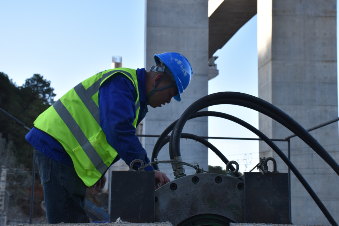 施工人员操作液压千斤顶。(丽江融媒记者 杨四娟 摄)