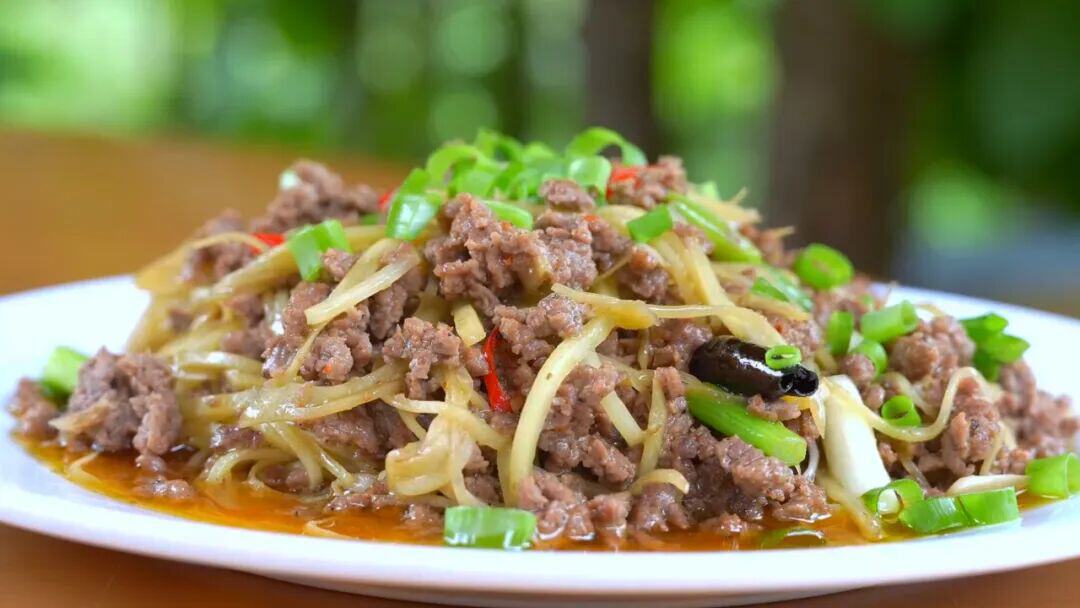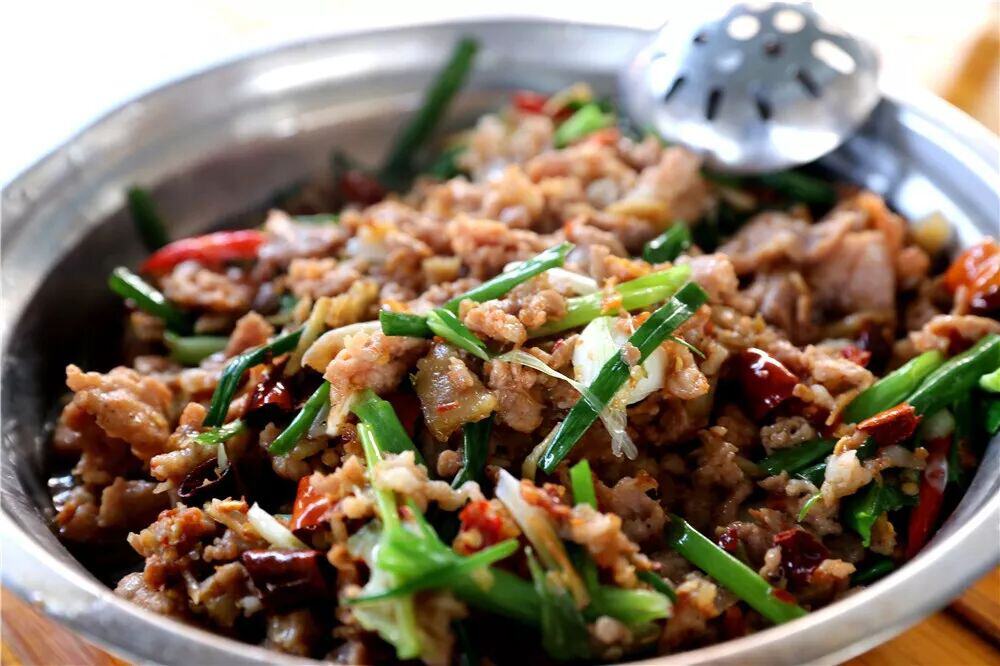 新鲜猪肉切片,肥肉入锅熬出香味醇厚的猪油,再放入姜葱蒜等香料伙同瘦肉一起爆炒,炒出来的瘦肉香嫩、肥肉酥脆,尝一口,唇齿间弥留猪肉香味。