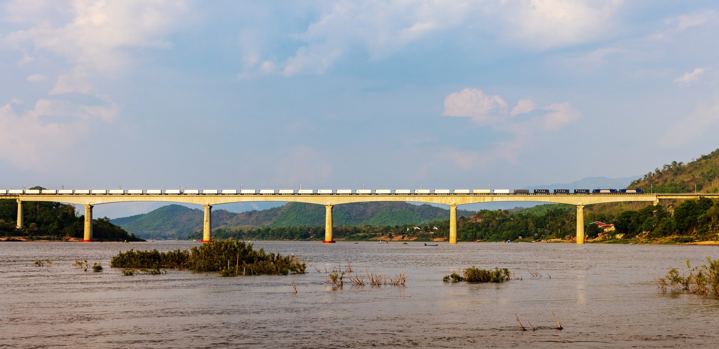 满载水果的货运列车平稳运行在中老铁路湄公河特大桥上。 通讯员 徐章位摄