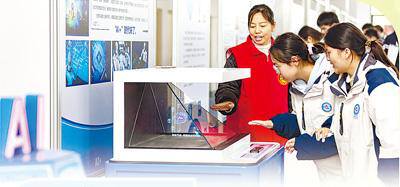 河南省安阳县高级中学学生在参观流动科技馆展览。 王建安 摄(影像中国)