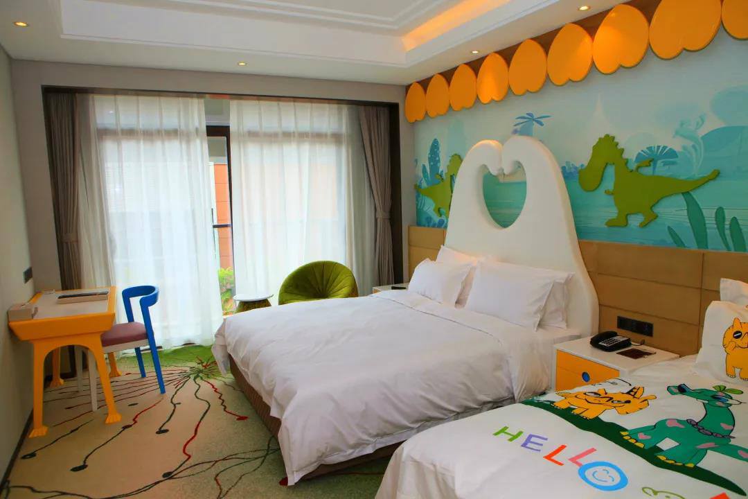 玩累了,入住温泉酒店,恐龙元素的亲子家庭房独具特色,带娃出游可以订购一间。