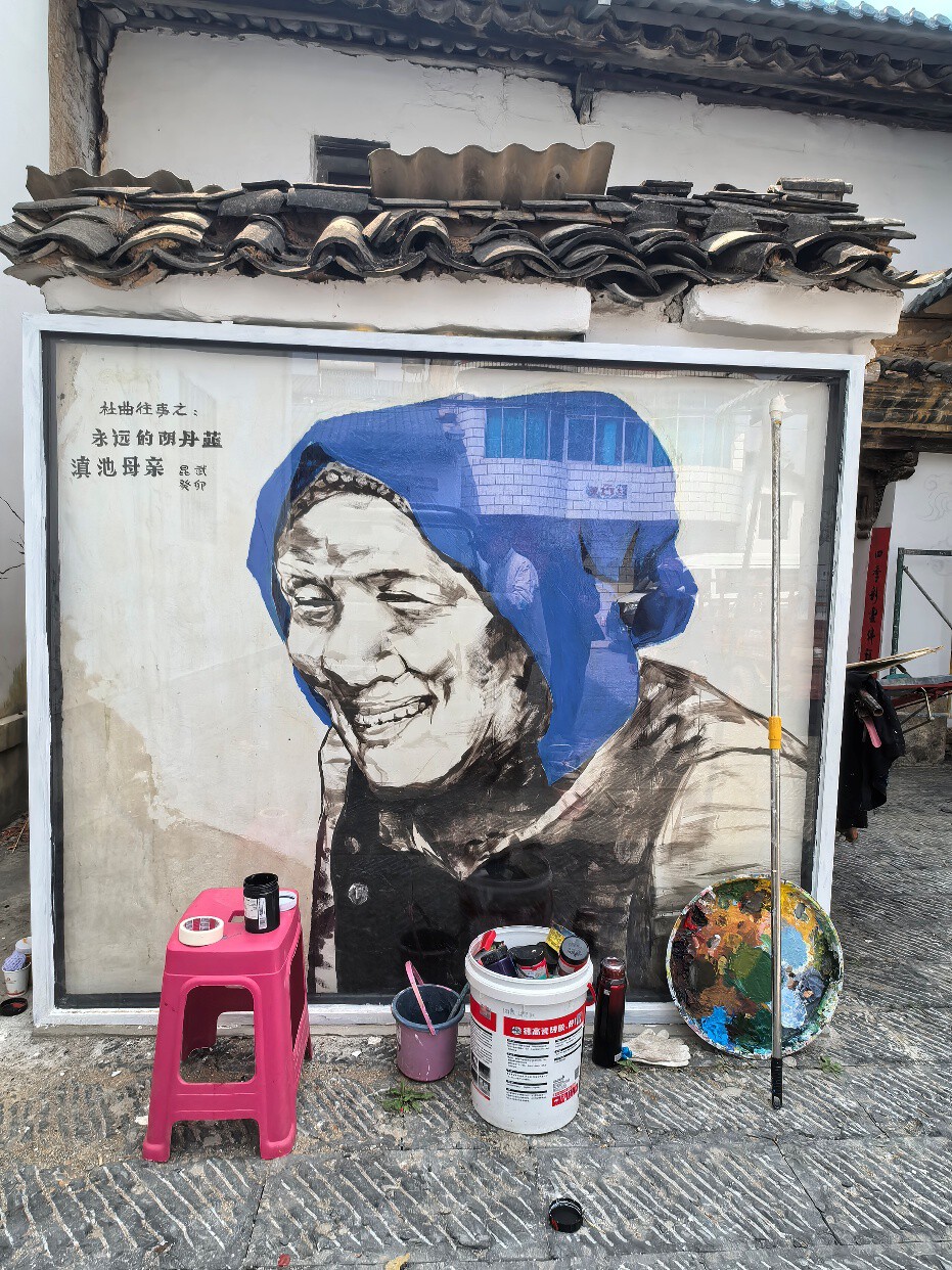 这是李昆武第二次住进杜曲村,2023年春天,他在村里的墙壁上创作了众多墙画,其中那幅《滇池母亲》早已出圈,成为不少人必到的打卡之地。