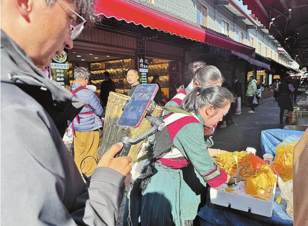 直播镜头转向忠义市场,商贩吆喝、小吃煎炸、付款提示音交织成热闹的新春市井交响曲。讲解员背着背篓选购春联、粉皮、山茶花等年货,纳西语与普通话自然切换,讨价还价间满是烟火温情。往来游客驻足镜头前,共贺新春,民族交融的暖意与新春的喜庆扑面而来。