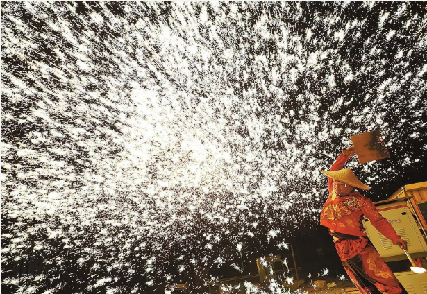除夕当天,安宁市鲁木纳龙狮艺术团表演打铁花。万千璀璨的铁花如流星疾雨般绽开,点亮夜空。记者 黄兴能 摄