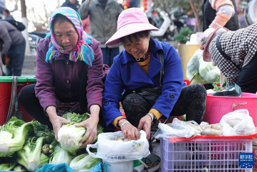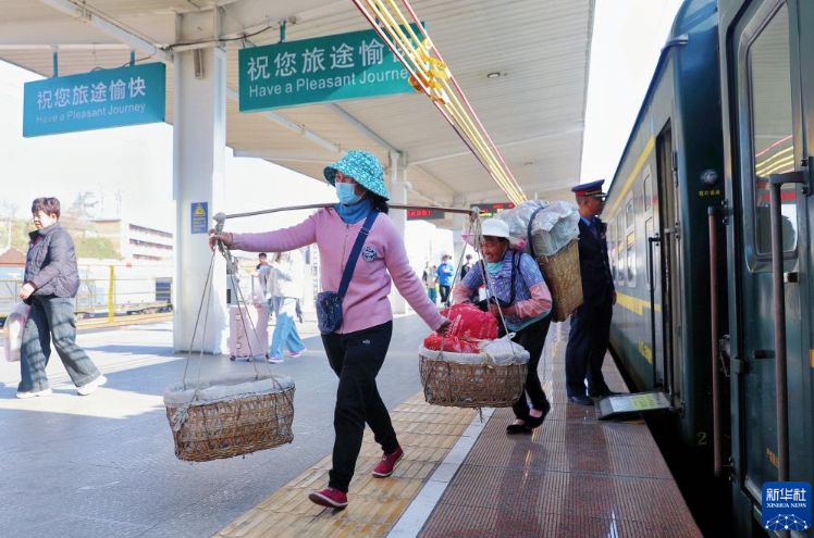2月13日,乘坐5652次列车、在曲靖站下车的菜农到当地年货大街售卖新鲜蔬果、土特产。新华社发(杨紫轩 摄)