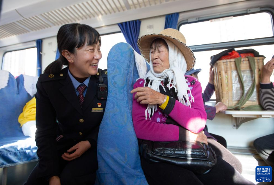 2月13日,列车员与菜农在5652次列车上交谈。新华社发(杨紫轩 摄)