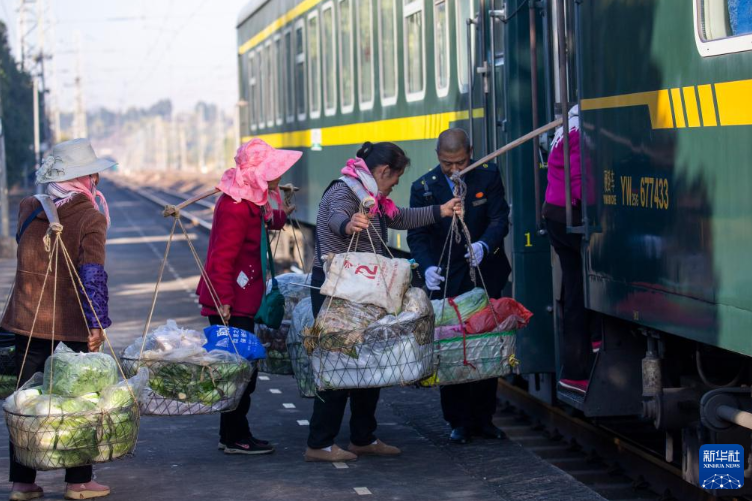2月13日上午,由昆明开往红果的5652次列车驶入吴官田站。云南省曲靖市马龙县吴官田村的菜农们背着新鲜蔬果、土特产乘坐这趟绿皮火车,在曲靖站下车直奔年货大街售卖。