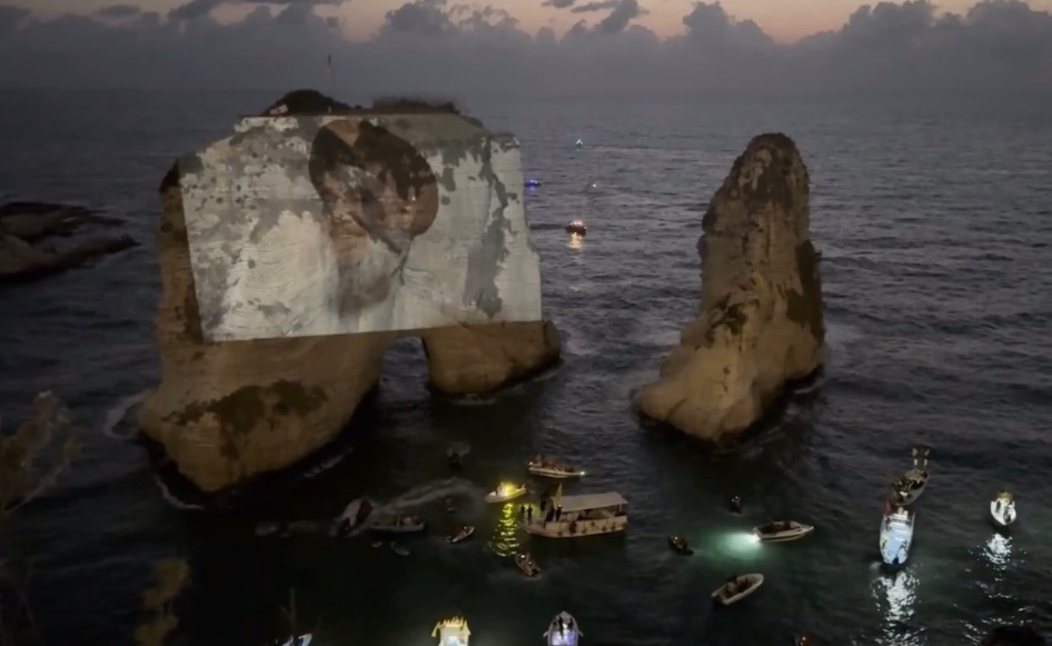 2025年9月25日黄昏,黎巴嫩首都贝鲁特西部海滨、著名旅游地标鸽子岩上,已故真主党领导人纳斯鲁拉的巨幅肖像被投射在岩壁上。