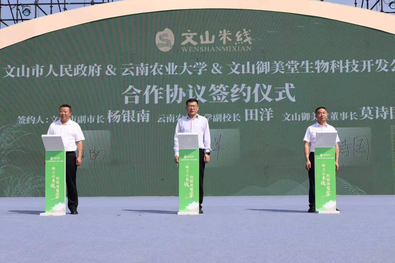 4月28日,2026年文山早点(米线)文化周在文山市华龙湖广场正式开幕。云南农业大学副校长田洋代表学校与文山市人民政府、文山御美堂生物技术开发有限公司正式签订三方合作协议,同步为“云南现代米线加工技术研发中心”和“云南食药同源大健康产品创新中心”揭牌,搭建起高校、政府与企业协同联动的产业研发平台,标志着校地企协同合作迈入常态化、阵地化的新阶段,为文山米线产业的科技创新提供了持续稳定的技术支撑。