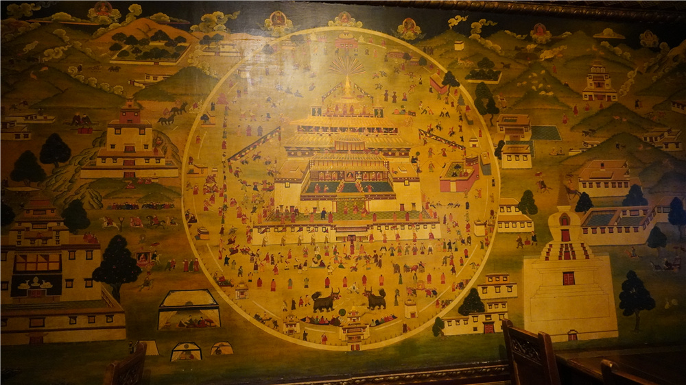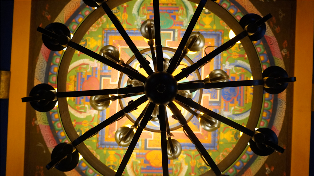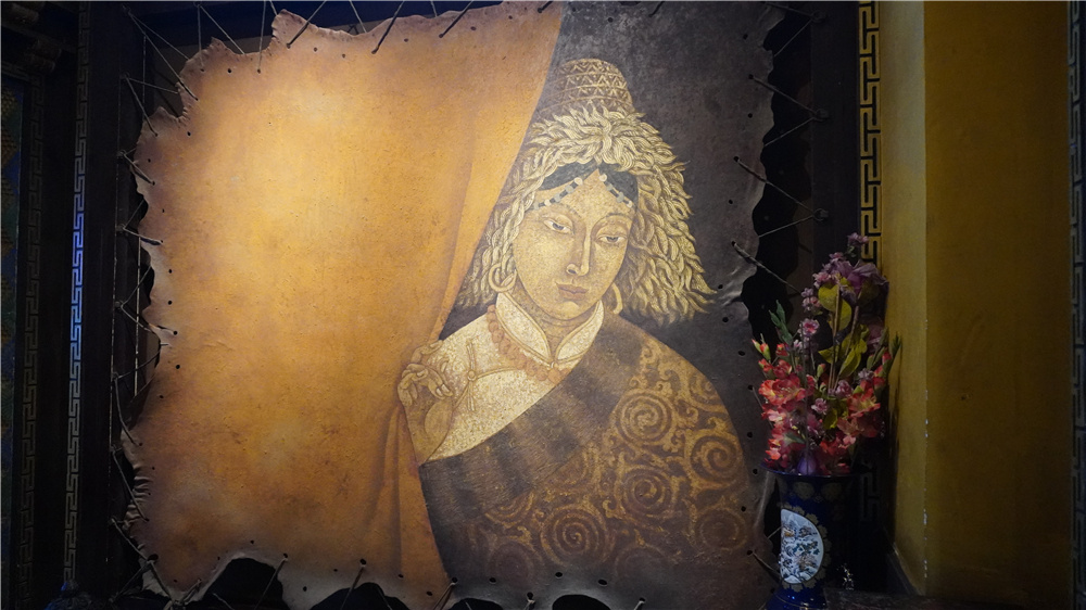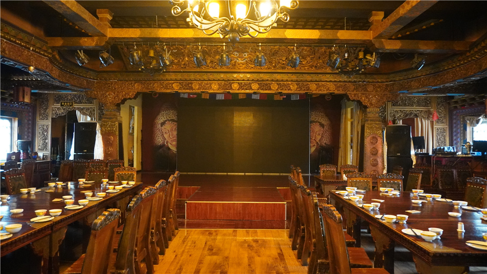 在二楼楼梯口,一整幅牦牛皮上绘有一位腼腆的藏族少女画像。往里走,巨大的红铜经筒让藏文化气息扑面而来。餐厅里,日照金山、香巴拉壁画令人惊艳,屋顶悬挂着藏纸做的灯笼、面具、唐卡、牦牛头、梁柱和顶棚,各种西藏老式彩绘家具错落分布,甚至房子的横梁都用西藏风情图案装饰。这里的一切无不展示着藏族的建筑艺术、雕刻艺术和装饰艺术的精美绝伦。很多客人认为,来到这里观赏陈设的一切,是一件不亚于吃饭的事情。