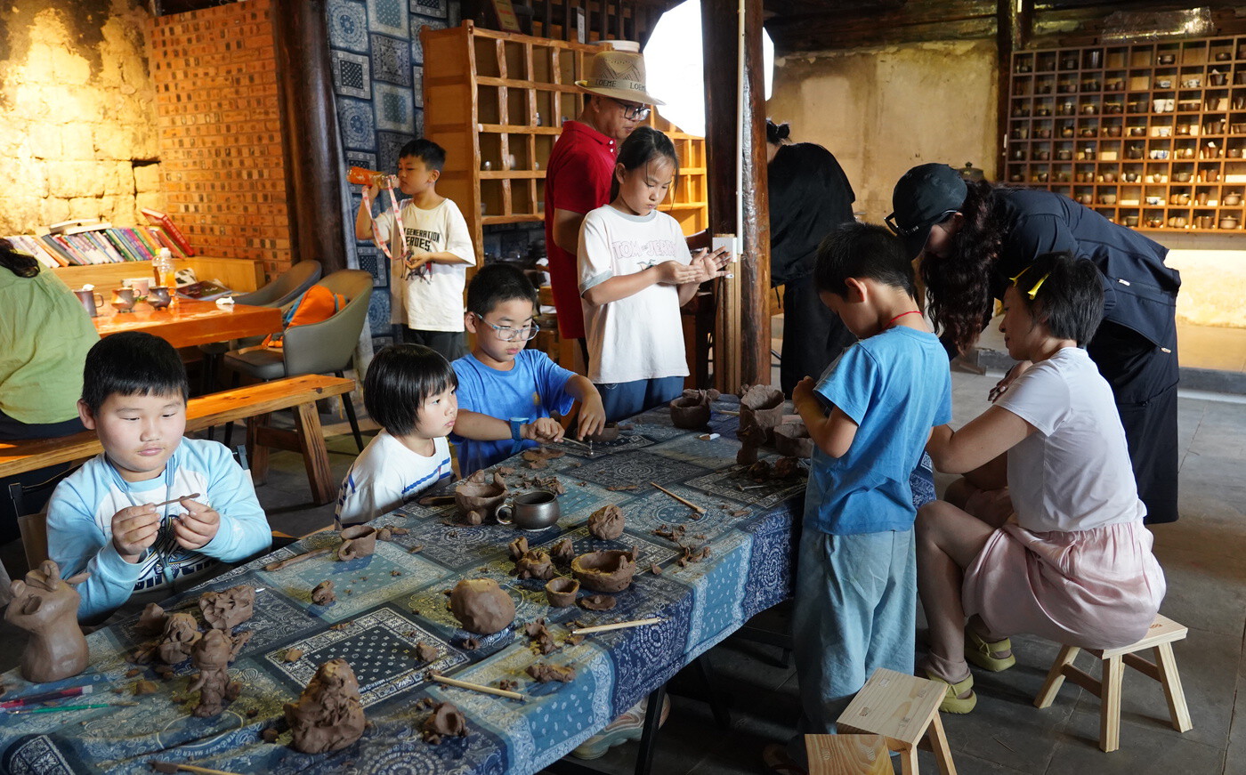龙凤山半山腰的“云端小院”门口,刘靖正热情地给湖南研学团的小朋友们介绍潦浒,身后跟着一群举着手机拍风景的家长。“慢点走,台阶上沾了松柴灰,小心滑。”他笑着叮嘱,指引一行人走进了接待厅。