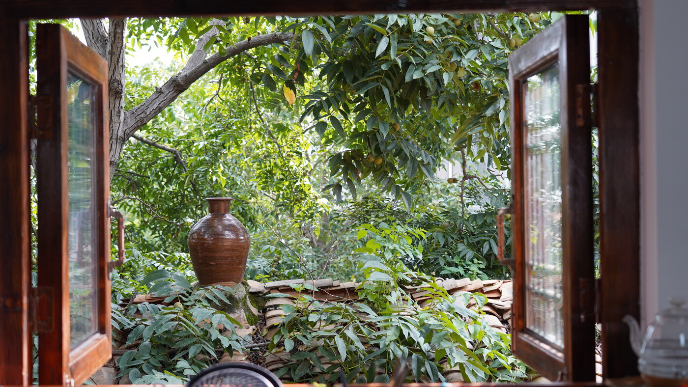 从王阳普的工作室出来,开车从潦浒老街的北市到南市,弯弯绕绕的巷子里,随处可见堆在门口的水缸、花瓶、咸菜罐。这些基本上都是柴烧的作品,大多有自然落灰形成的火痕,有的呈浅褐色,有的带点金黄,每一件都各具形态。