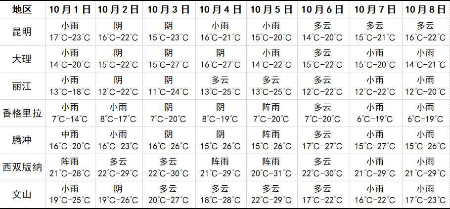 具体预报为:10月1日,德宏州、保山市西部、怒江州北部阴有中到大雨局部暴雨,其他地区多云有阵雨局部中雨。10月2日至5日,怒江州北部、昭通市北部阴有小到中雨,普洱市南部、临沧市西部、德宏州、保山市西部、怒江州南部、迪庆州西部多云短时有阵雨,其他地区晴间多云。10月6日(中秋):全省大部分地区晴间多云,适宜赏月。德宏州西部、保山市西部、怒江州、迪庆州南部以及大理州西部多云,短时有阵雨,其他地区晴间多云。10月7日至8日:文山州南部、红河州南部、普洱市南部、西双版纳州、临沧市南部以及德宏州西部多云,有阵雨,局部中雨,其他地区晴间多云。
