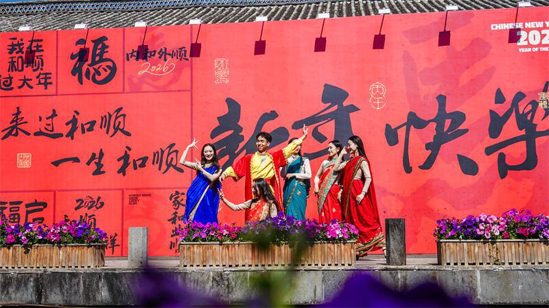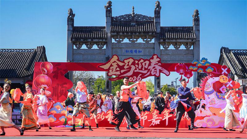 九乡风景区推出了“2026九乡新春地质文化国潮节”。智能机器狗舞狮、龙狮巡游、非遗川剧变脸、彝族民俗展演接连登场,投壶挑战、蒙面击鼓等互动游戏吸引众多家庭和年轻客群参与,现场气氛热烈,景区游客接待量和营业收入双增长。
