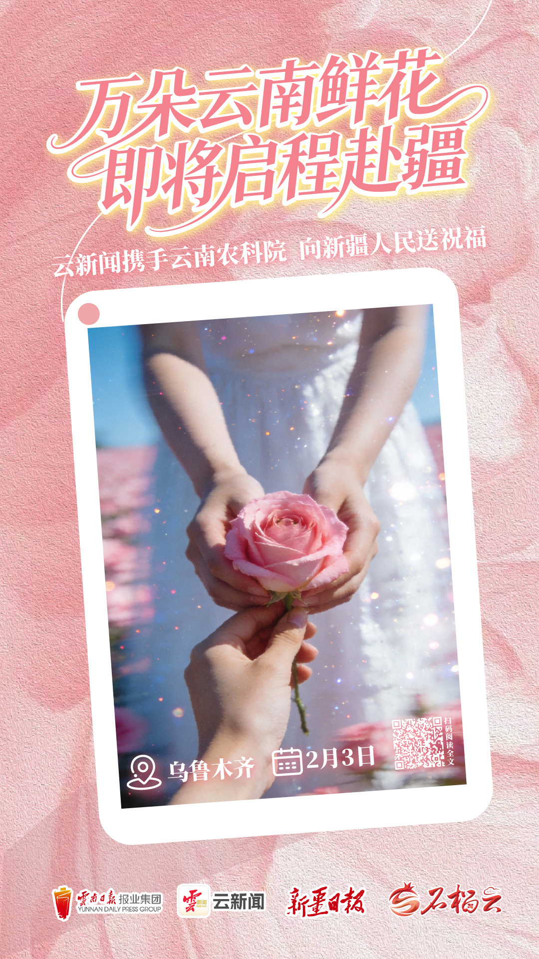 2月3日,在新疆乌鲁木齐,云南日报报业集团云新闻客户端将携手新疆日报石榴云举办赠花活动。这份来自云南的新春问候,将带着春城的芬芳与暖意,在雪域边疆绽放,让花香满城,情暖万家。