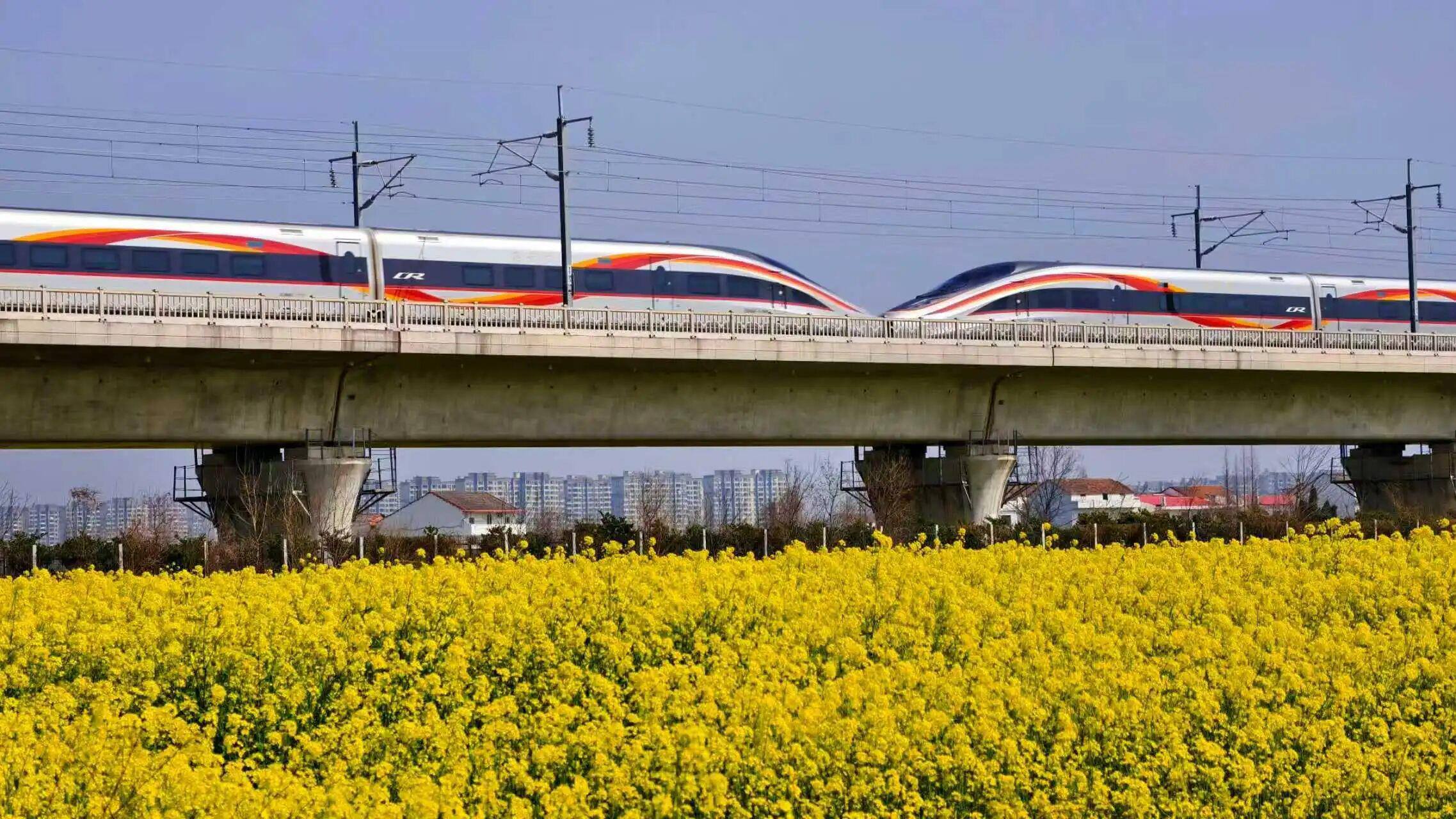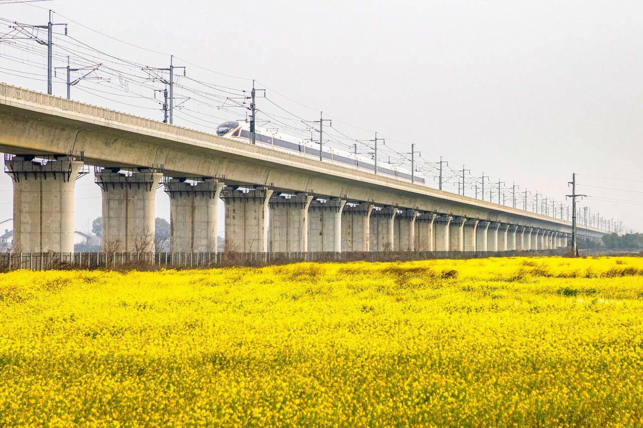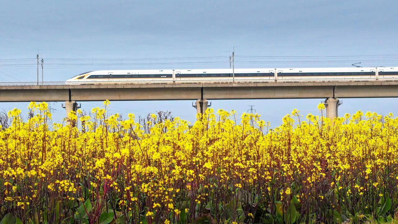 △南昌东站附近,复兴号行驶在油菜花海中。