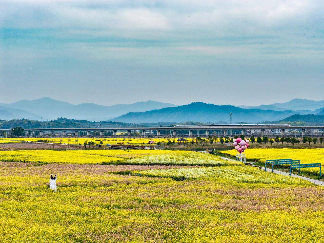 △列车驶出浮梁东站,线路旁五彩油菜花盛开,宛如油画。