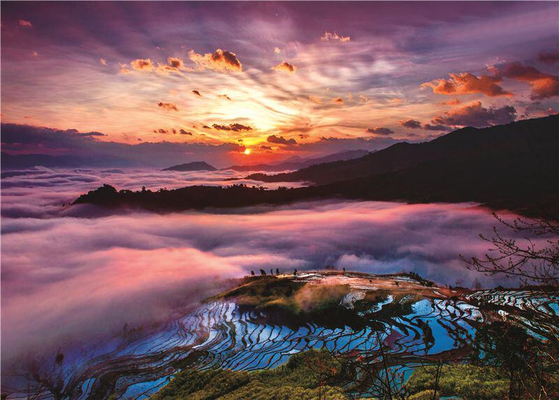 当北国银装素裹,元阳的哈尼梯田正沐浴在一年中最“魔幻”的光影里。灌水后的梯田如千万面碎裂的明镜,从山脚铺陈至云端。清晨,云海是沉默的观众,梯田是静默的舞台。当日出撕破天际,第一缕金光不是“照射”,而是“流淌”——它顺着田埂的脉络,从山顶的金黄,到山腰的玫紫,再到山谷的湛蓝。