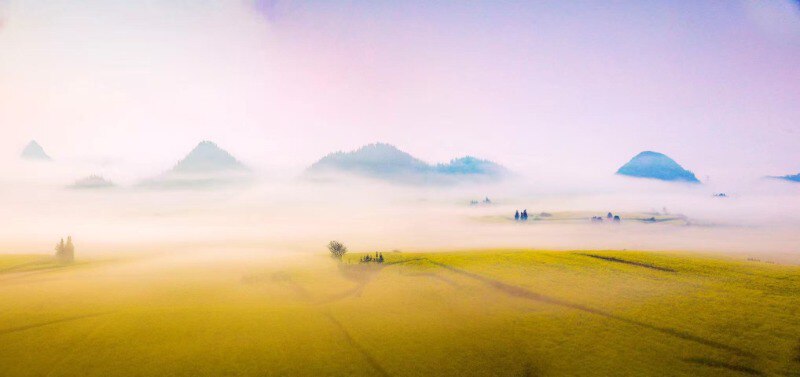 若说元阳是光的雕刻,罗平便是色彩的爆炸。八十万亩油菜花在二月同时醒来,将喀斯特峰林变成一片悬浮于金色海洋中的翠绿岛屿。这金黄不单是视觉的,更是嗅觉的、听觉的。花香浓烈如蜜,蜂鸣是大地沉稳的脉搏。