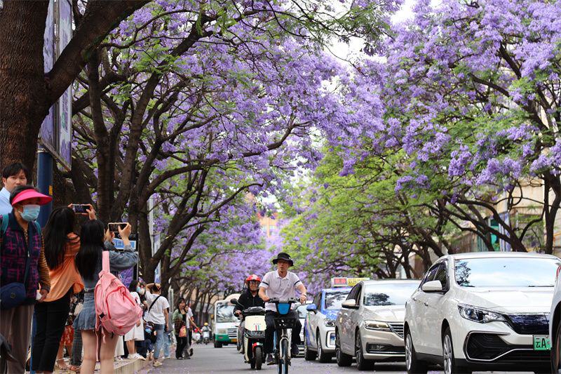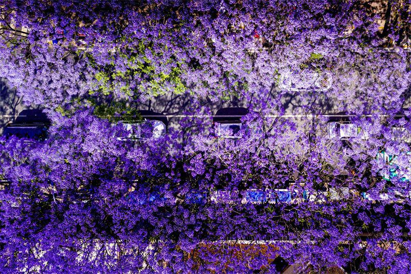 春城无处不飞花,但五月的昆明,属于一场蓝紫色的雪。教场中路,街道变成了一条流淌着紫色花河的峡谷。花朵密密匝匝,将天空切割成碎钻。