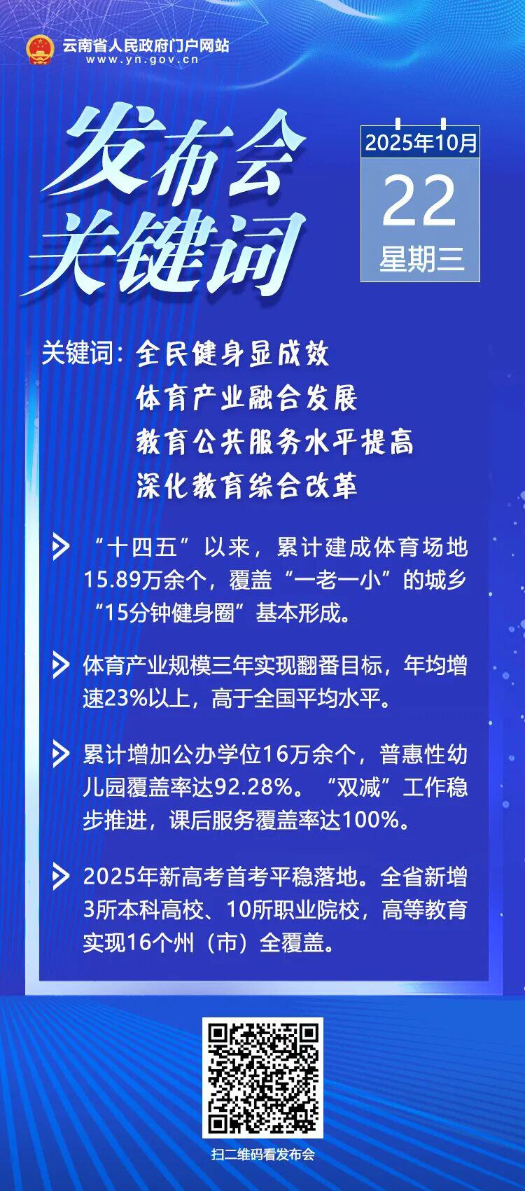 10月22日上午,云南省“高质量完成‘十四五’规划”系列新闻发布会·教育体育事业高质量发展专场在云南海埂会堂召开,云南省教育厅、云南省体育局有关负责人介绍云南省“十四五”时期教育体育事业发展情况,并回答记者提问。