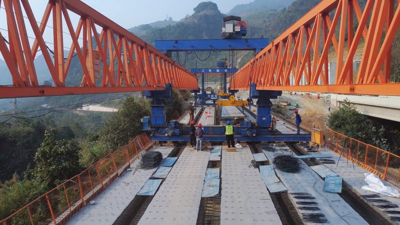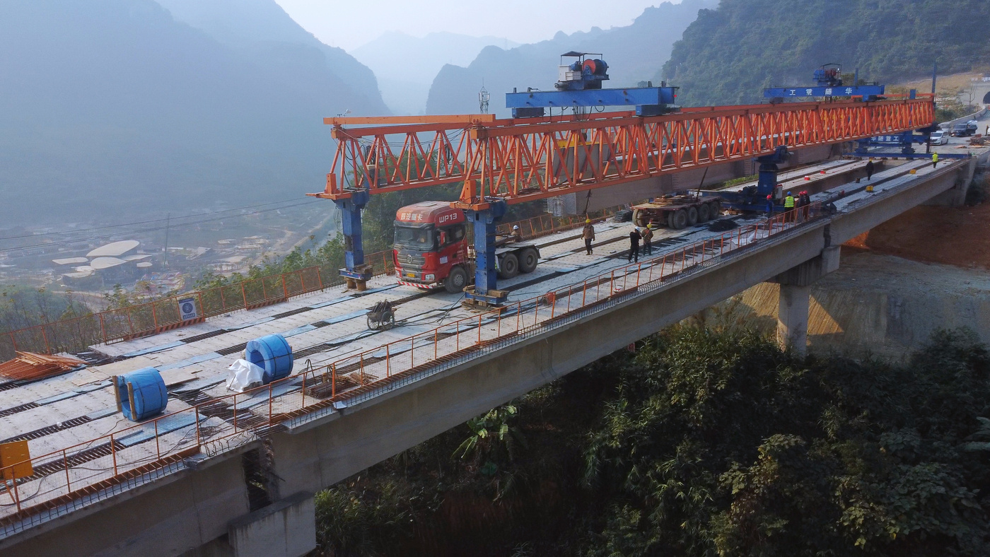 施工现场,曼棍2号大桥横跨山间,工程车辆有序作业,施工人员专注操作,在保障安全的同时全力推进工程进度。随着指挥指令下达,最后一榀T梁在架桥机的平稳牵引下精准落入预定桥墩支座,大桥贯通任务圆满完成。