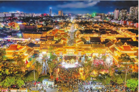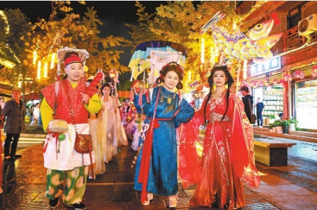 在滇池之畔的昆明融创文旅城,蔚蓝的池水与绚烂的民族服饰交织,空飘热气球与咖啡市集同在……夜幕下,游客们手提灯笼,穿梭于云津夜市,与“古代商贩”讨价还价,观看传统技艺表演,品尝地道云南小吃。据了解,“云津夜市”情景演出是环滇池区域文旅联动的重要一环,后海商业街区通过系列演艺活动,丰富了环滇池黄金岸线的夜游体验。