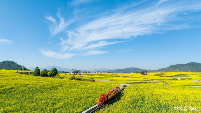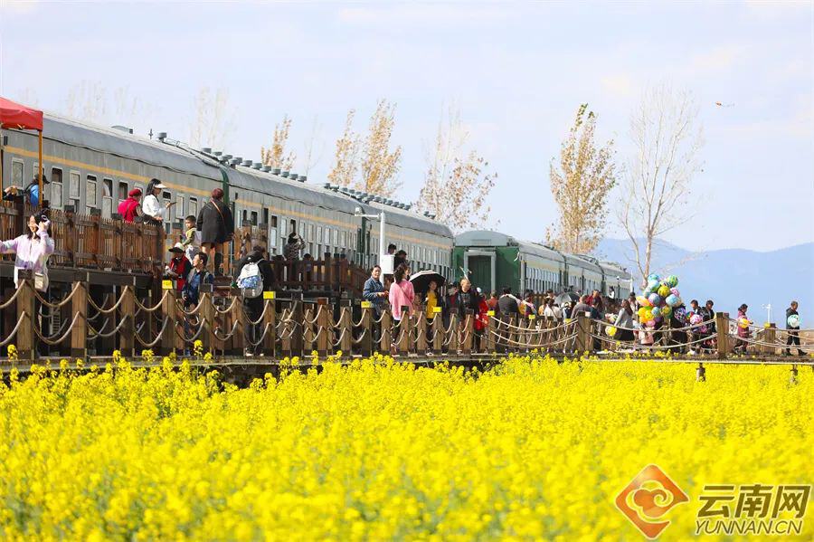 油菜花海与绿皮火车相映成趣