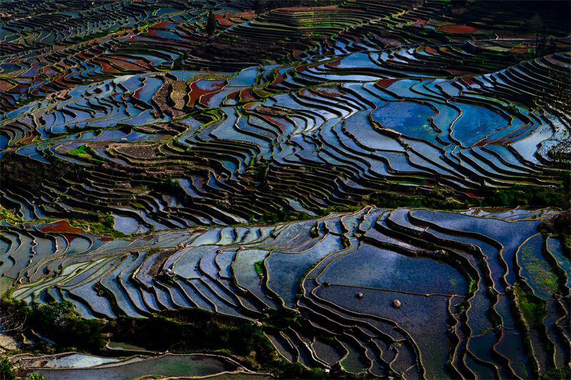 阳光反衬在大大小小的梯田中,如同打翻的调色盘一般,五光十色,熠熠生辉。沿着盘山公路前进,欣赏老虎嘴景区的壮阔,在坝达感受落日与梯田融为一体的绝美,错落有致的线条铺在山间,太阳的余晖洒落山前,余光照在万亩梯田的水面上,金光闪闪,让人流连忘返。