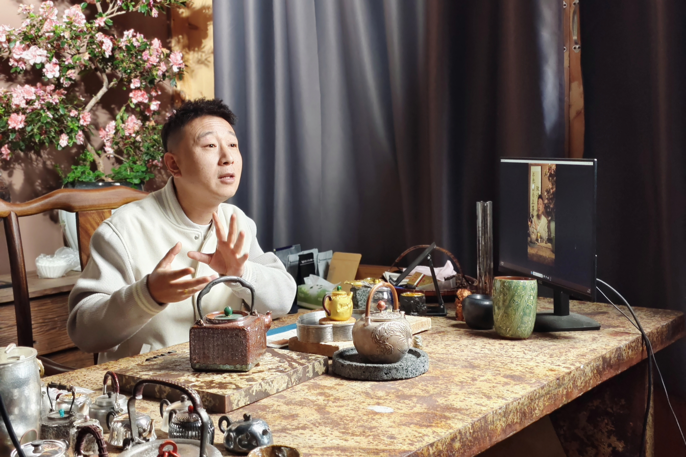 这段经历,也让陈战找到了新的创业方向。“我从头到尾学过,懂一把壶的制作流程和讲究,也知道谁家擅长什么。”2022年5月,他在新华村开始试着直播销售银器。与其他主播不同,他不靠吆喝带货,而是耐心讲解錾刻、塑形等工艺,告诉粉丝多看少买,懂了再下手。“银器不是快消品,很多人可能一辈子只买一把,得真正了解才行。”这份真诚,让陈战积累了稳定的客户群,与新华村20多个银器工坊深度合作,年销售额近200万元。