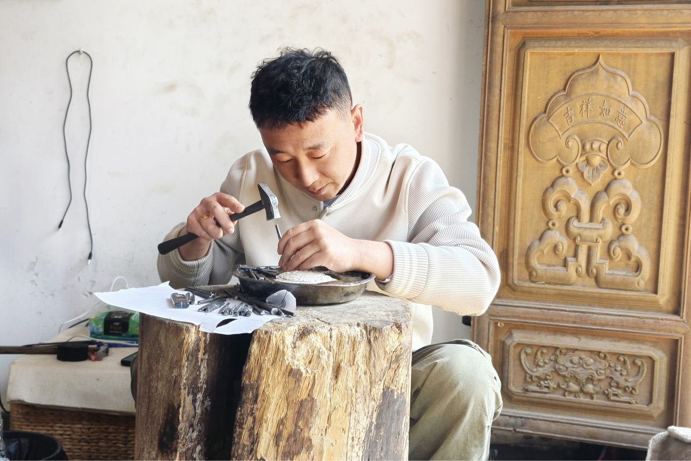 “在西安,最多看到几十款银壶,但这里家家有工坊,户户有手艺,藏着上万把形态各异的壶。”爱喝茶的陈战,不仅被器物吸引,更被这里的人留住了心。起初他只是在村里看壶,去的次数多了,师傅们便和他熟络起来。他索性在村里租了房,跟着学锻打、学錾刻,不仅掌握了银器制作流程,更融入了当地生活。“房东喊我去吃饭,邻居请我去做客。那种自然亲切的感觉,很多年没有过了。”陈战说,他从游客真正变成了村里的“熟人”。