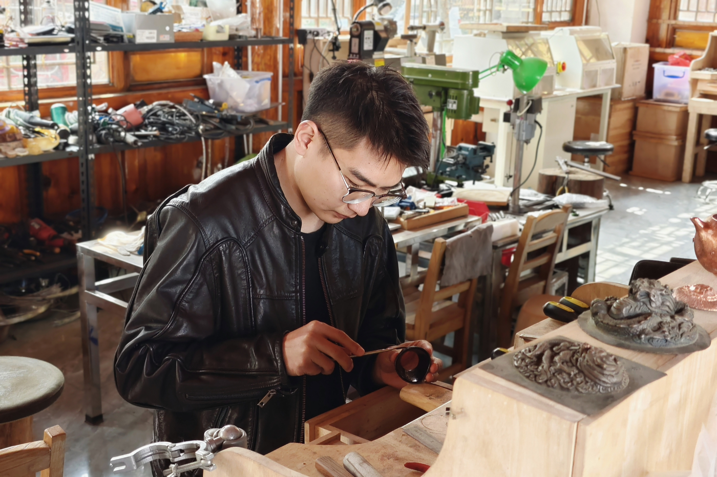陈战学习银器錾刻。李丽 摄