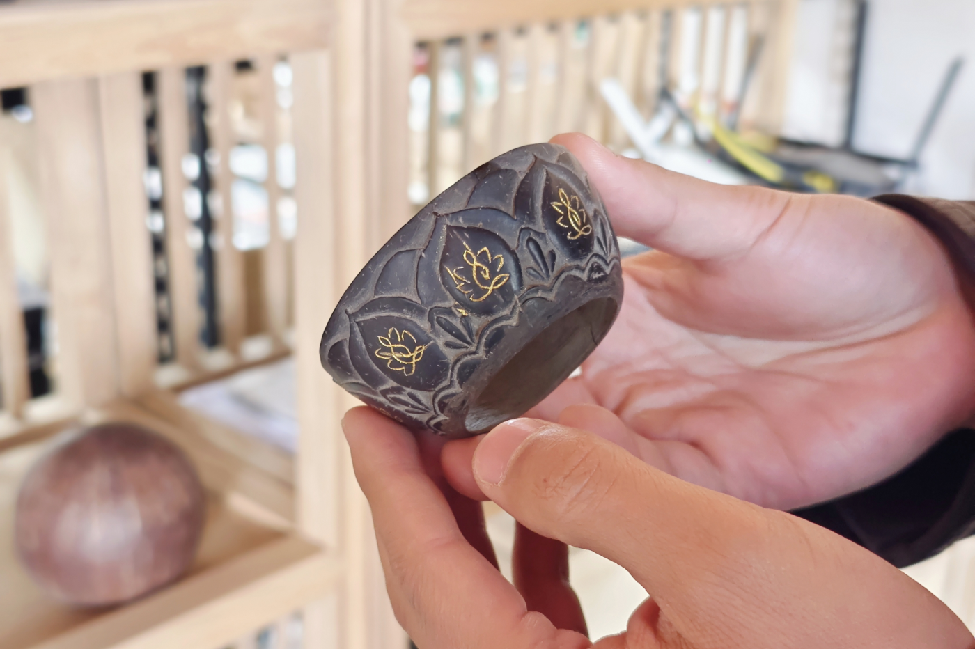 黄鲁辰正在制作的椰子壳茶杯。李丽 摄