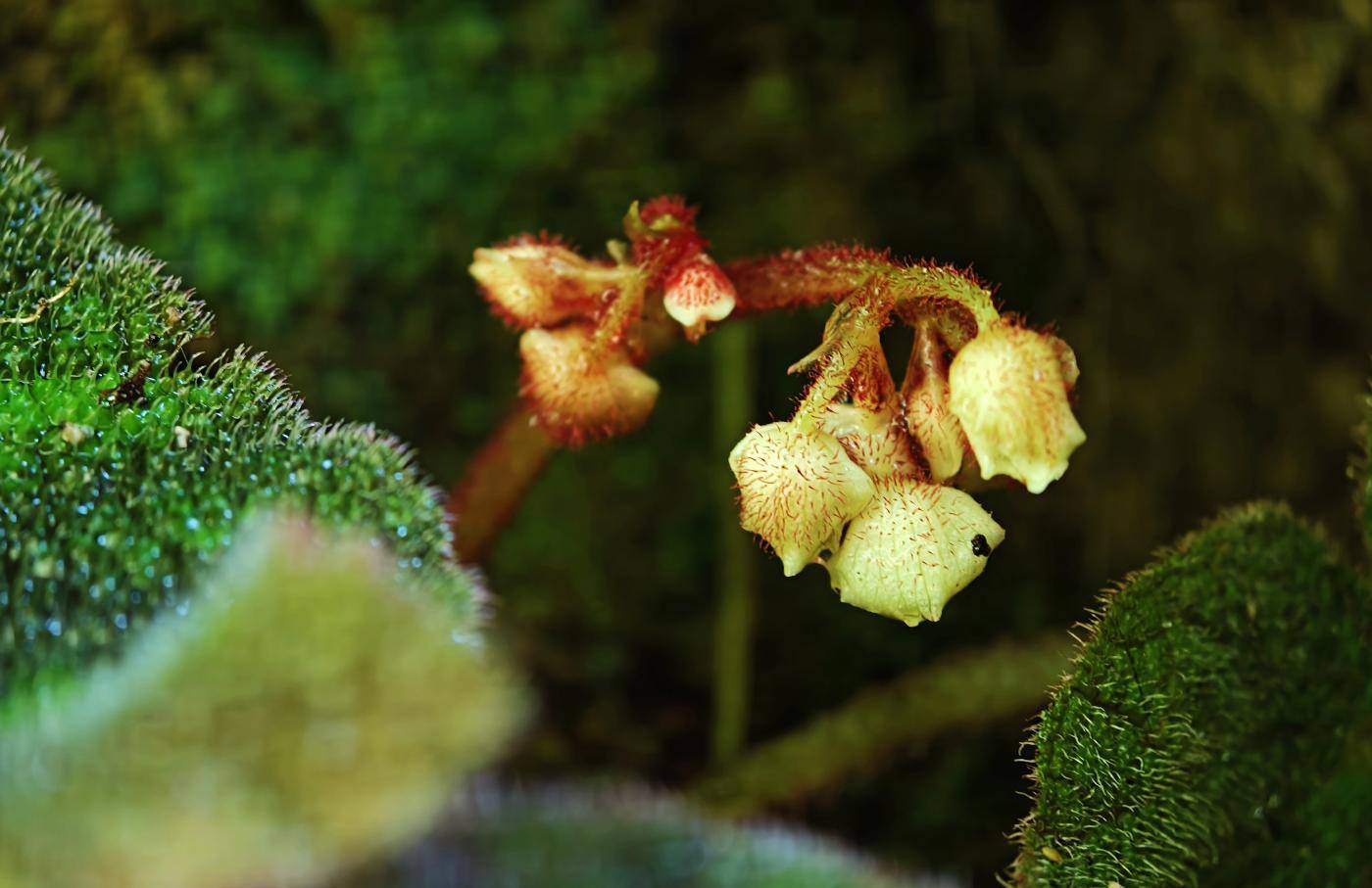 在秘境幽谷中,几簇变色秋海棠花悄然绽放在林下一处悬崖峭壁上,其粉红色花簇及复古色叶片与青绿岩石相映成趣,形成冬日里“幽谷崖缝藏秀色,石缝生花映日辉”的独特意境。更奇特的是,凸凹不平的叶面以深绿、淡黄、鲜绿等为主色调,这些颜色以叶柄、叶脉为起点自然散开,叶片像一幅幅“活着”的天然泼墨画,充满着怀旧感和复古韵味。另外,在微焦镜头下可以清晰地看到,几只不知名的小昆虫,蹒跚在布满圆锥状绒毛的“绿毯”上,呈现出一幕幕动植物“和谐共生”的灵动图景。