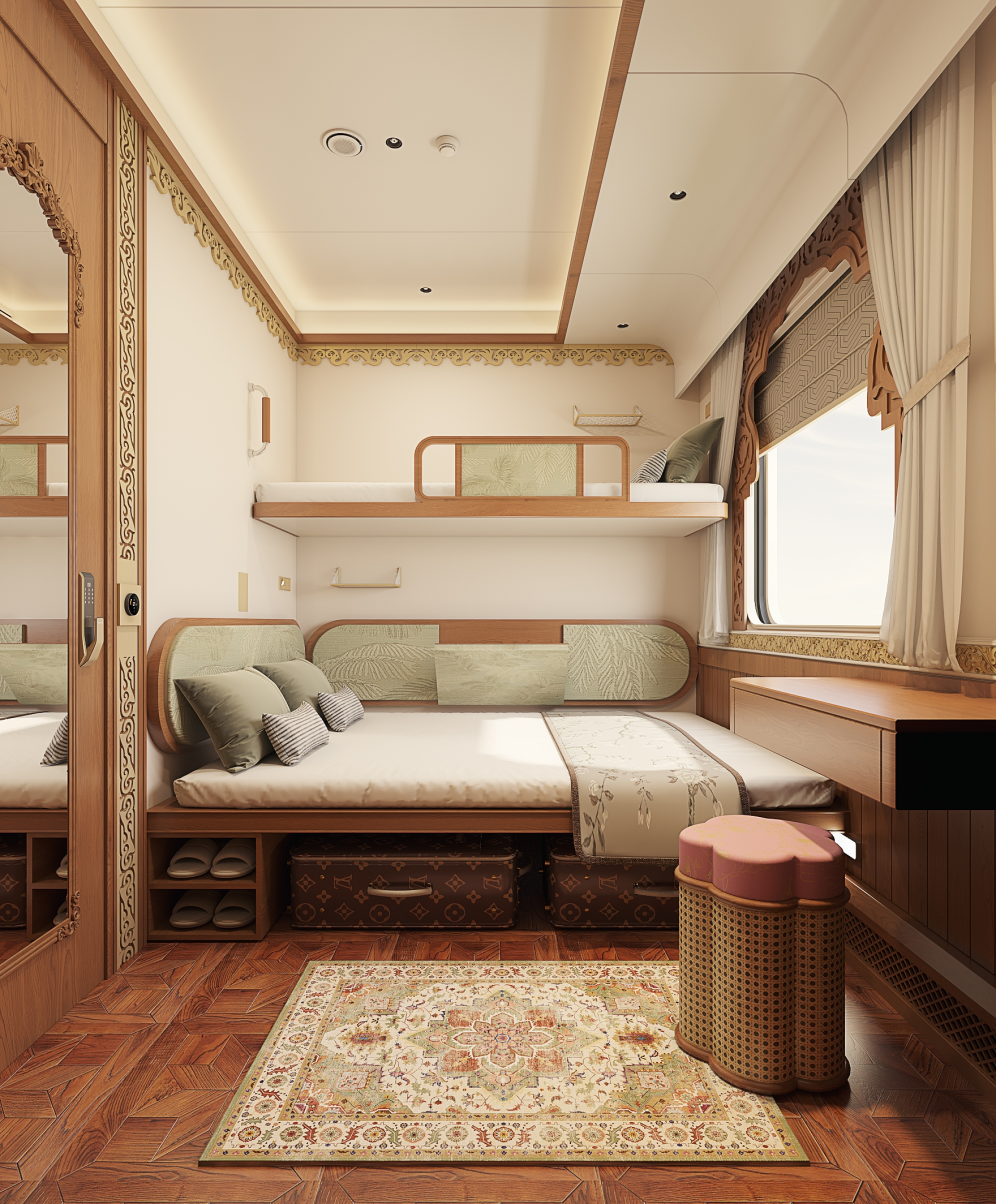 “昆明号”跨国旅游列车全列有16节车厢72间包厢,定员264人。其中,安途尊享3人间面积12平方米,配备“多功能抽拉沙发床”、有200厘米×150厘米大床+200厘米×75厘米上铺、干湿分离的卫生间,并配备防滑地板、紧急呼叫按钮等适老化设备,可满足老年群体需求;悦途品质4人间面积10平方米,配备200厘米×75厘米上下铺、多功能折叠桌、铺位遮光帘、可调节阅读灯,每节车厢均设2个淋浴间、洗漱间和卫生间。